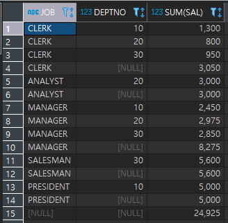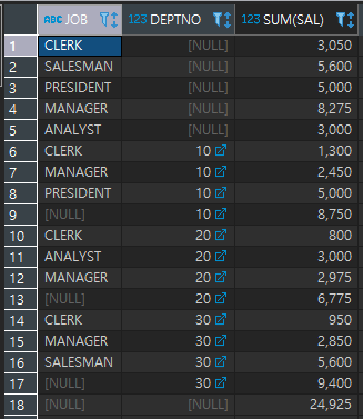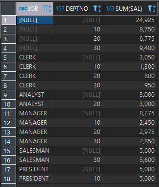 SELECT JOB, DEPTNO, SUM(SAL) FROM EMP GROUP BY ROLLUP(JOB, DEPTNO);