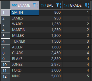 FROM EMP JOIN SALGRADE ON (SAL BETWEEN LOSAL AND HISAL);