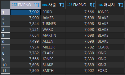 SELECT 사원.EMPNO, 사원.ENAME 사원, 매니저.EMPNO, 매니저.ENAME 매니저