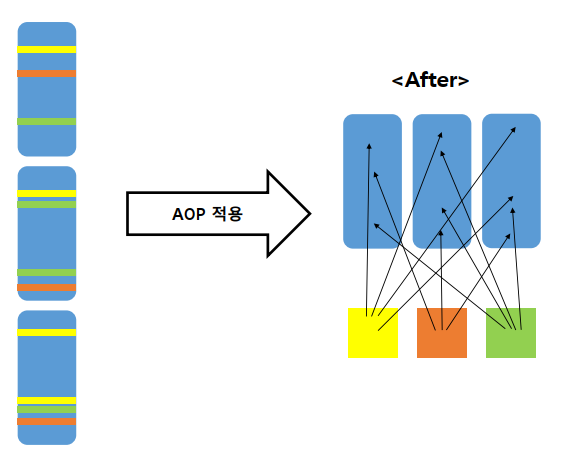 문제를 해결하기 위한 핵심적인 부분( CC : Core Concern )과, 전체에 적용되는 공통적인 부분( CCC : Cross Cutting Concern )을 나누어 프로그래밍함으로써 공통모듈을 여러 코드에 쉽게 적용할 수 있도록 지원하는 기술