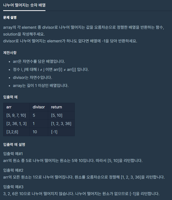array의 각 element 중 divisor로 나누어 떨어지는 값을 오름차순으로 정렬한 배열을 반환하는 함수, solution을 작성해주세요. divisor로 나누어 떨어지는 element가 하나도 없다면 배열에 -1을 담아 반환하�