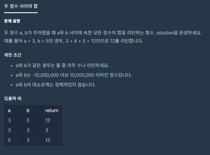 두 정수 a, b가 주어졌을 때 a와 b 사이에 속한 모든 정수의 합을 리턴하는 함수, solution을 완성하세요. 예를 들어 a = 3, b = 5인 경우, 3 + 4 + 5 = 12이므로 12를 리턴합니다. 제한 조건 a와 b가 같은 경우