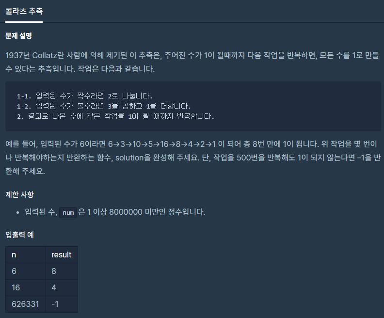 1937년 Collatz란 사람에 의해 제기된 이 추측은, 주어진 수가 1이 될때까지 다음 작업을 반복하면, 모든 수를 1로 만들 수 있다는 추측입니다. 작업은 다음과 같습니다. 1-1. 입력된 수가 짝수라면 2��