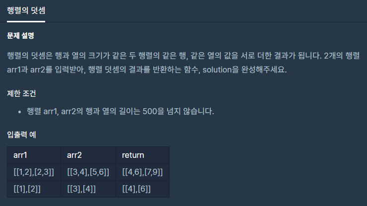 행렬의 덧셈은 행과 열의 크기가 같은 두 행렬의 같은 행, 같은 열의 값을 서로 더한 결과가 됩니다. 2개의 행렬 arr1과 arr2를 입력받아, 행렬 덧셈의 결과를 반환하는 함수, solution을 완성해주세요