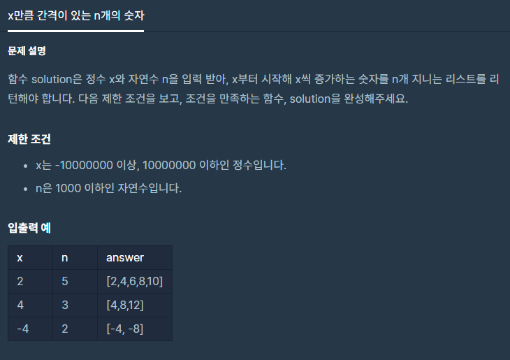 함수 solution은 정수 x와 자연수 n을 입력 받아, x부터 시작해 x씩 증가하는 숫자를 n개 지니는 리스트를 리턴해야 합니다. 다음 제한 조건을 보고, 조건을 만족하는 함수, solution을 완성해주세요. ��